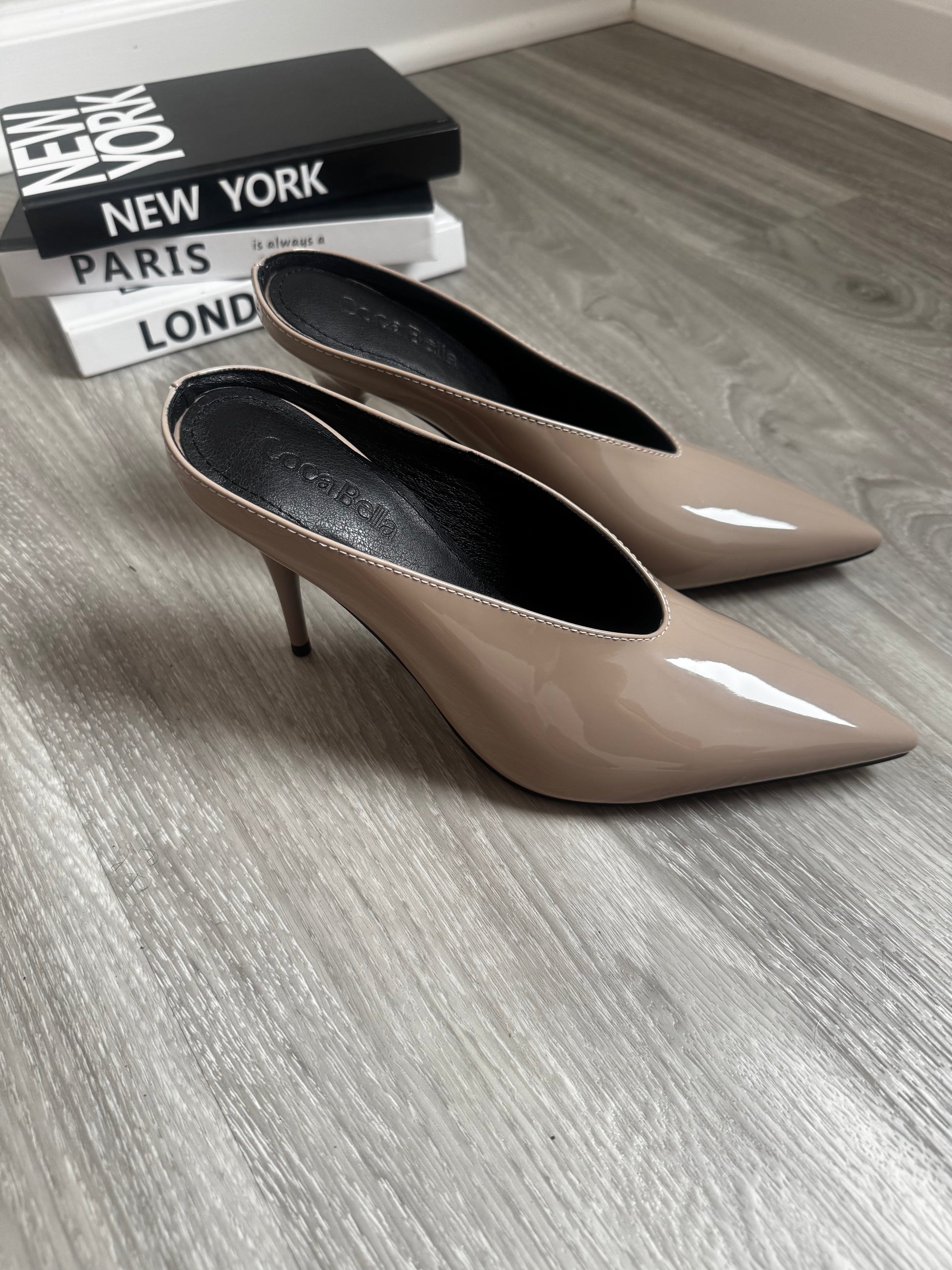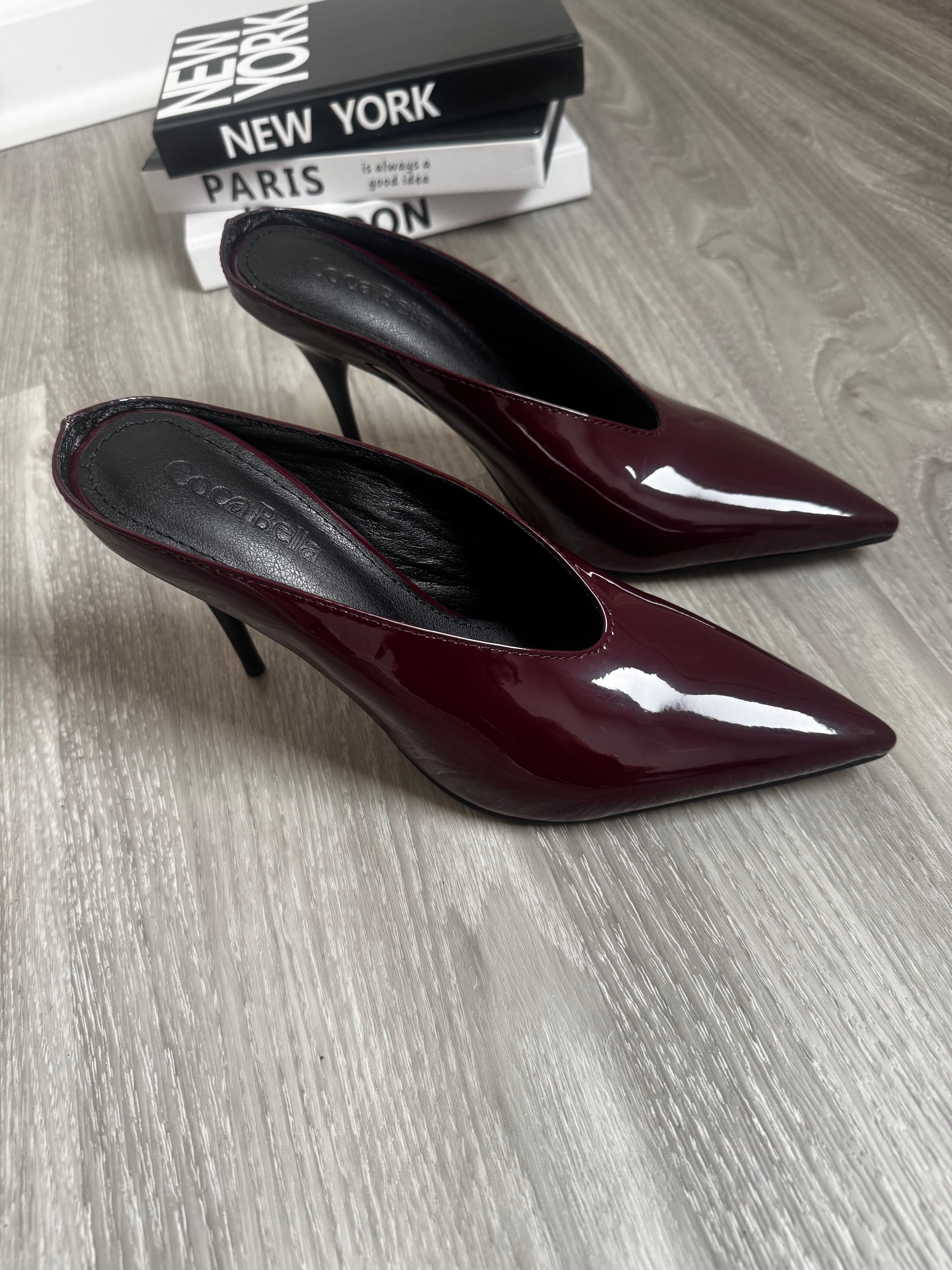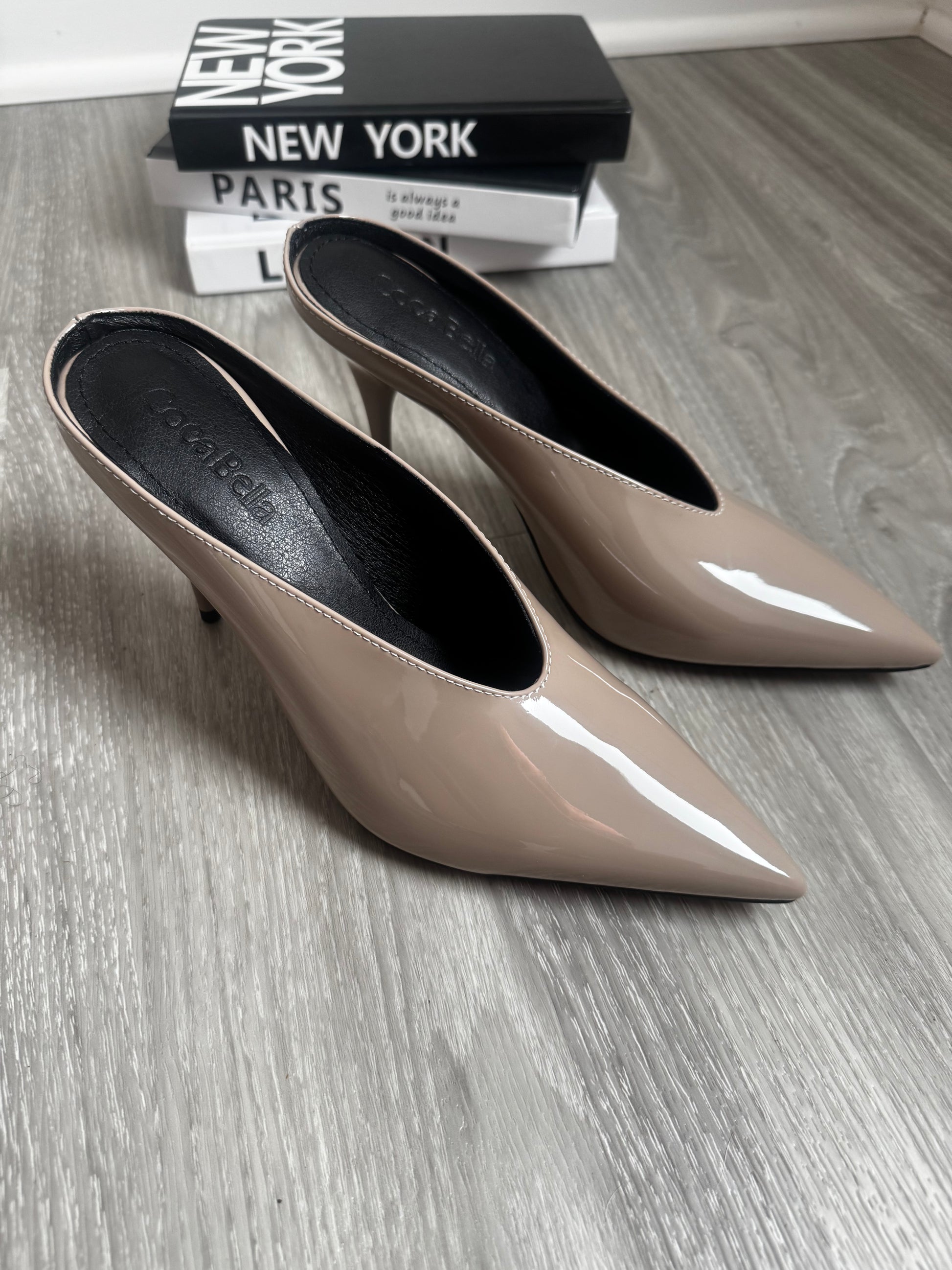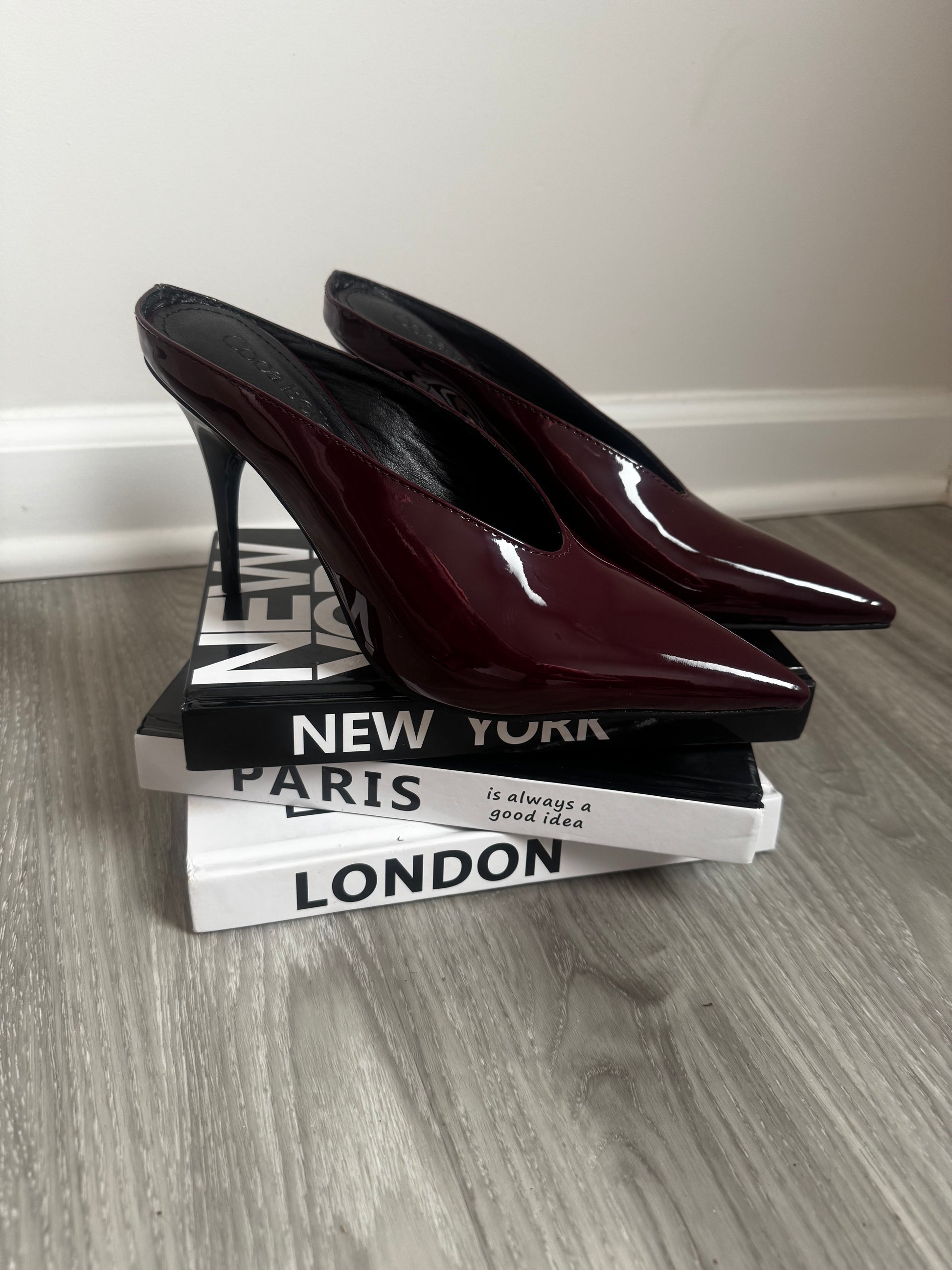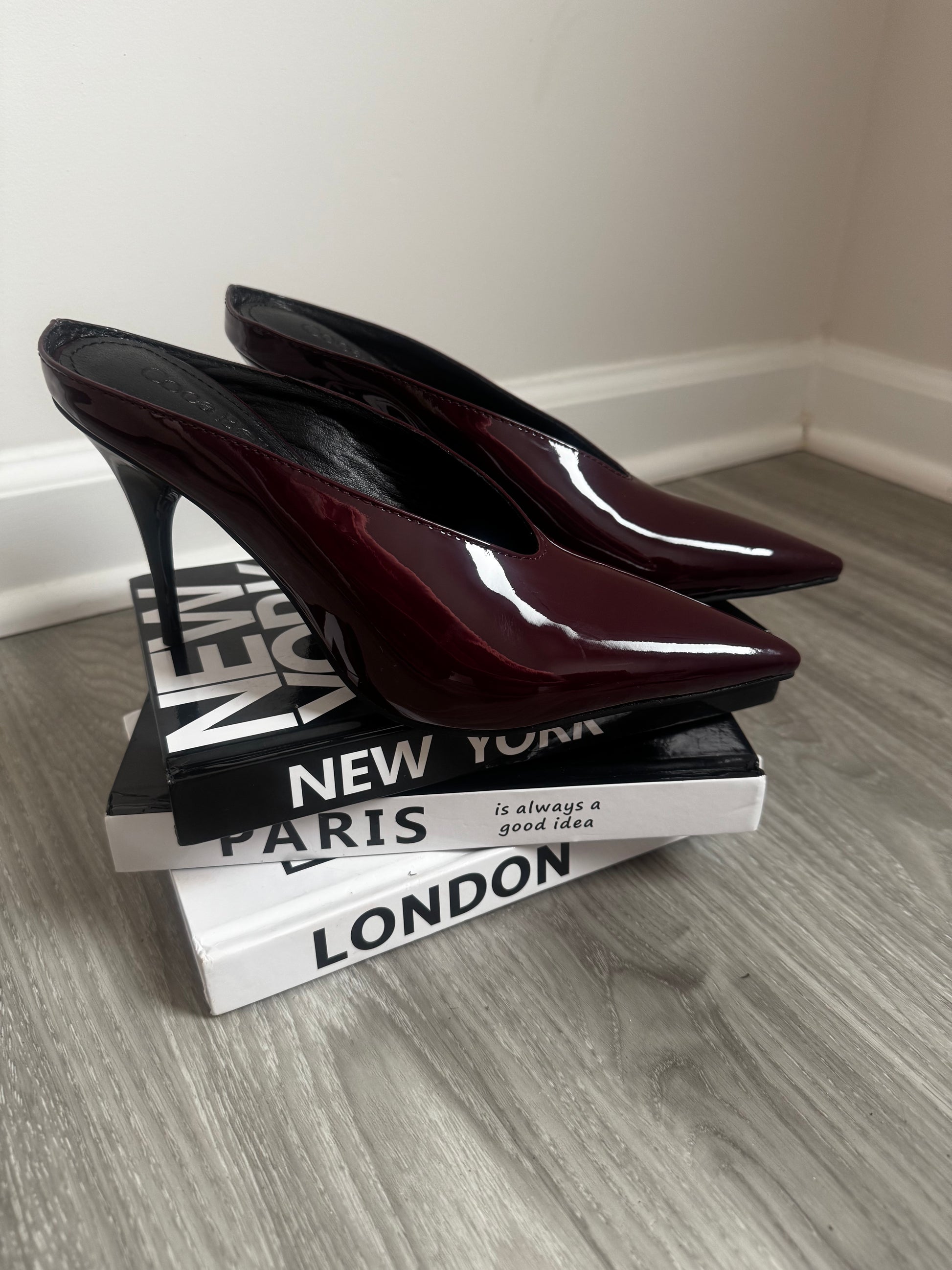 Patent leather, pointy toe, 3.5 inch mules. Wear with jeans, work clothes or for brunch.